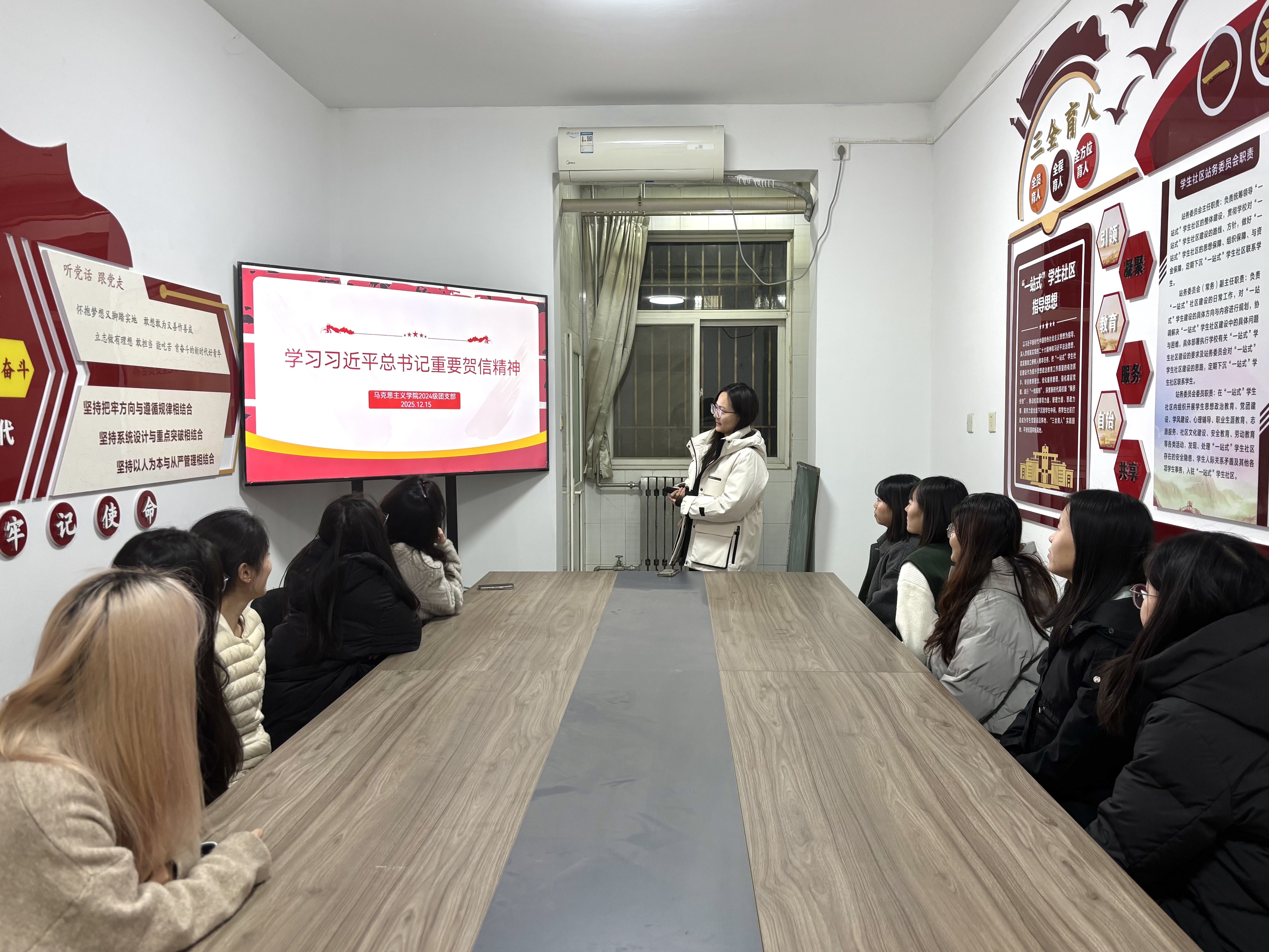 为进一步引导广大团员青年坚定理想信念、勇担时代使命,12月15日晚,英国上市公司3652024级团支部于11号公寓“一站式”员工社区开展“学习习近平总书记重要贺信精神”主题团日活动。活动由2024级团支书张睿怡主持,全体共青团员参与。